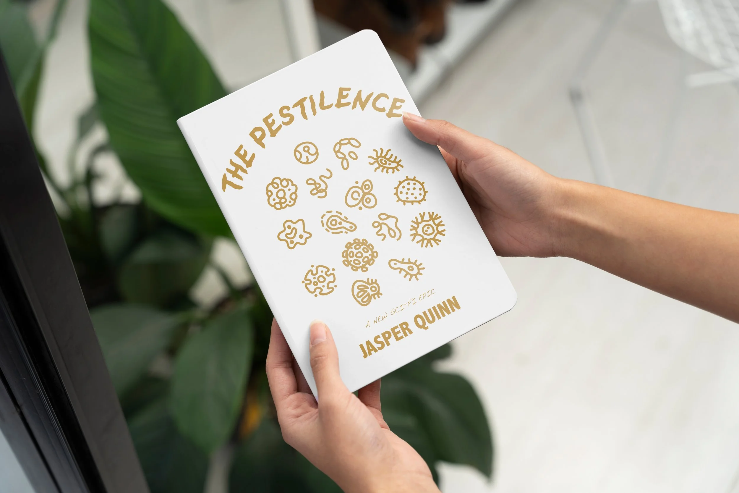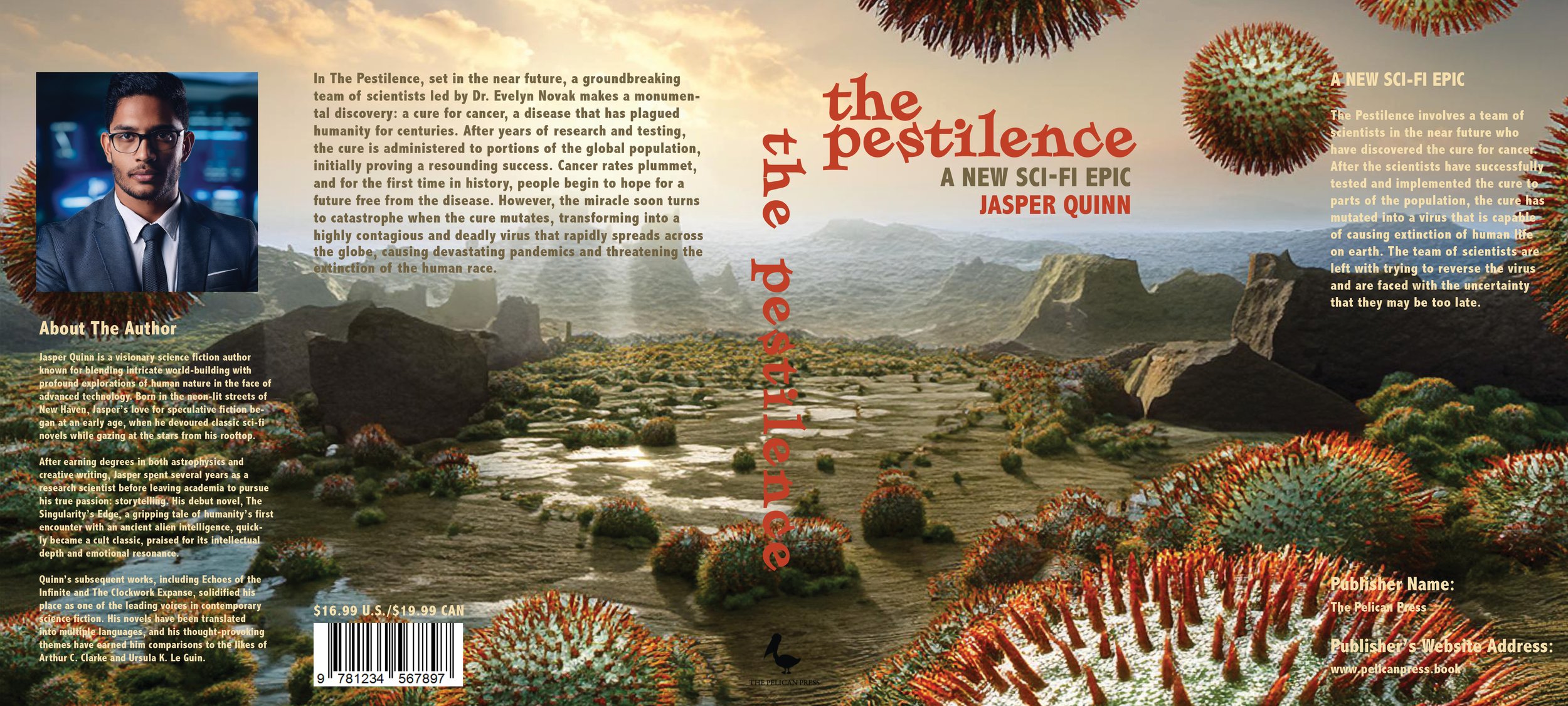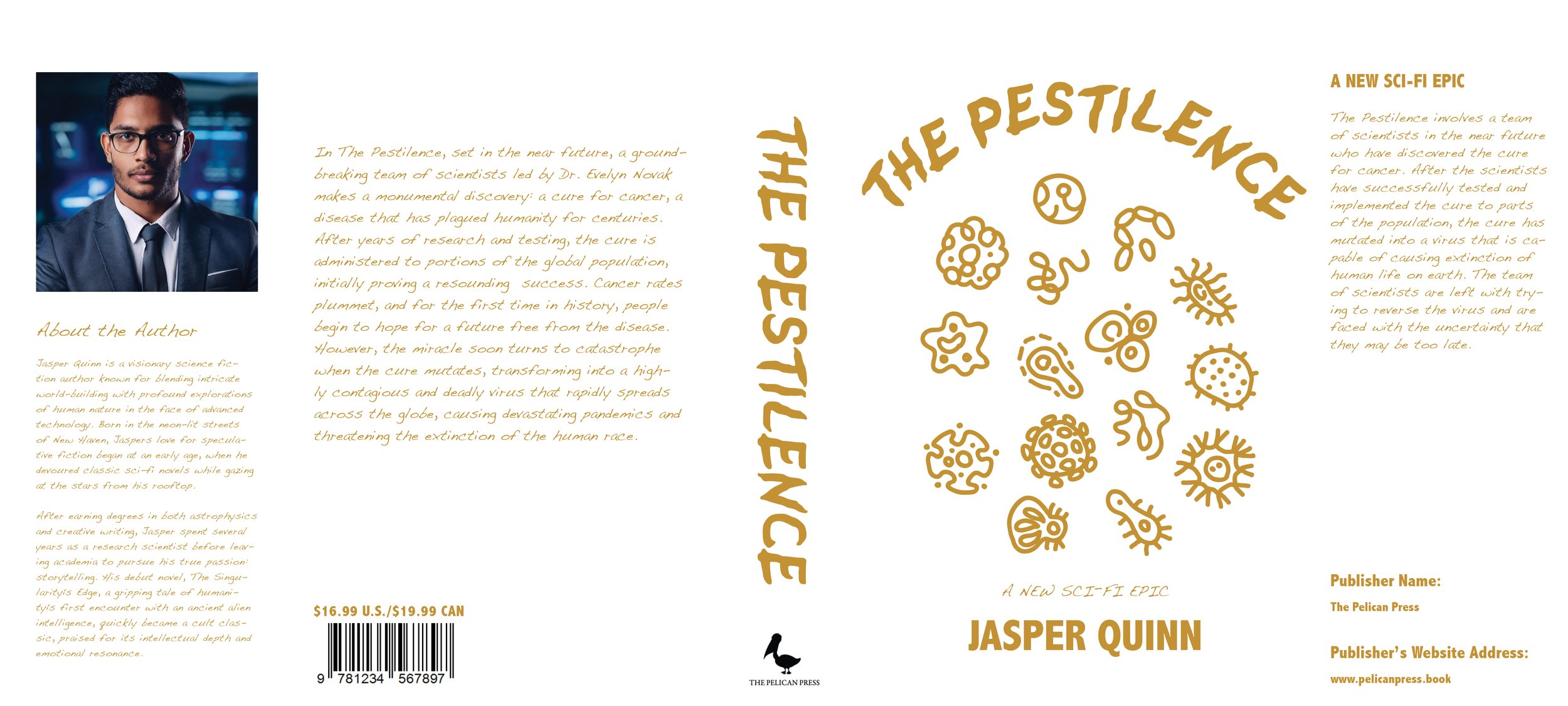 The Pestilence is a final class project created for a Typography course at SNHU. The goal was to create a full spread book cover that showcased effective typographic techniques, and met print standards. The Pestilence is an original book title and the genre of book, is science fiction/sci-fi. There are two versions of the book cover design, one regular edition (pictured right) and the classic edition cover showcased below. The intended audience of The Pestilence is 21-35 year old men and women that have an interest in science fiction pop culture such as sci-fi movies, art and novels. The concept for The Pestilence involves a team of scientists in the near future who have discovered the cure for cancer. After the scientists have successfully tested and implemented the cure to parts of the population, the cure has mutated into a virus that is capable of causing extinction of human life on earth. The team of scientists are left with trying to reverse the virus and are faced with the uncertainty that they may be too late.